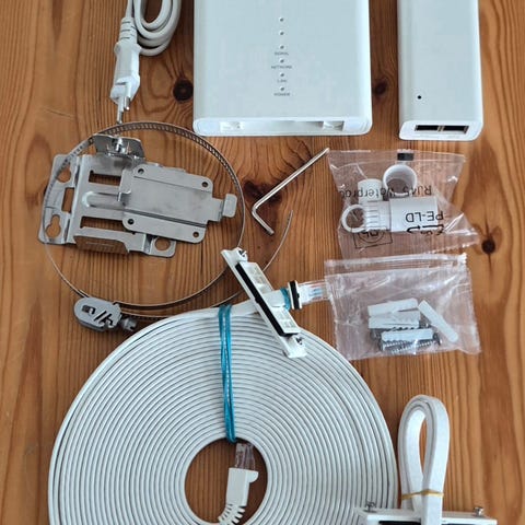 Mukana kuvan tarvikkeet: ZTE MC7010 modeemi, PoE virtalähde, asennusteline (seinä- ja tolppa asennusta varten ruuveineen), alkuperäinen litteä pitkä kaapeli, verkkojohto, sekä avaintyökalu, laite saa virran verkkojohtoa pitkin.