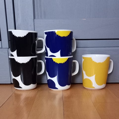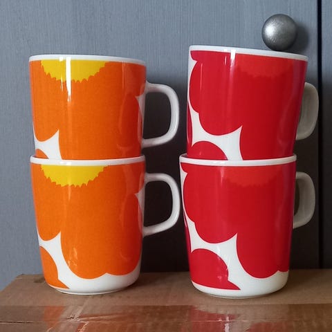 Marimekko uusi uudet lahja lahjaksi kahvikupit kahvikuppi kahvimuki kahvimukit kahvi kuppi kupit muki mukit käyttämätön keltainen keltaiset punainen punaiset oranssi oranssit unikot