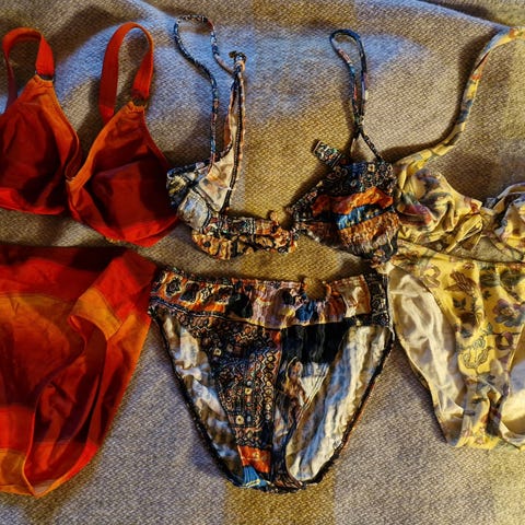 Naisten bikinit, koko 70F. Kukalliset Fantasy merkkiset, housut kokoa 40. Mustaraidalliset Primadonnan, housut kokoa 40. Näissä pueni langsnjuoksu, mitä en lähtenyr korjaamaan, kun näin kuvatessani. Voi ommella pienillä pistoilla piiloon. Yhteishintaan 8e tai 5e kpl erikseen.