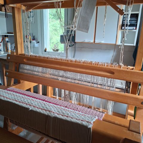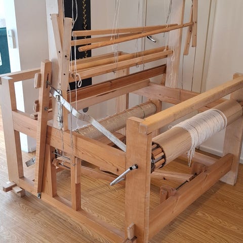 Puinen kangaspuurunko ja siihen kuuluvia osia. Mukana useita puisia runko-osia, poikkipuita ja tukia sekä kangaspuita varten tarkoitettuja lisäosia. Sopii kangaspuiden kokoamiseen tai varaosiksi vastaavanlaisiin puisiin kangaspuihin. Tarkemmat mitat ja osien määrä eivät käy ilmi kuvasta.