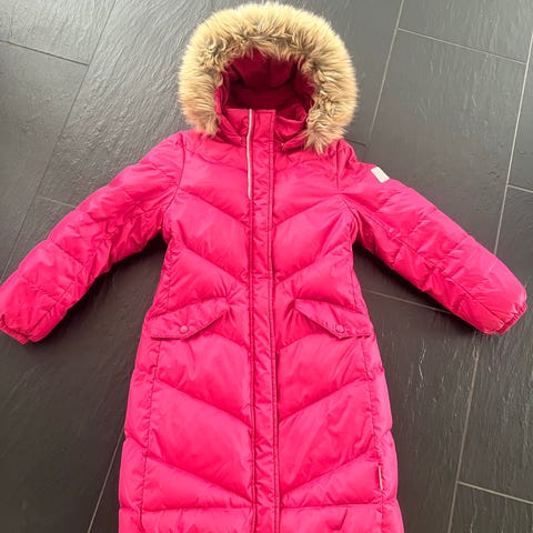 Reiman pitkä harmaa/heijastava untuvatakki. Hupun saa irti samoin kuin hupun karvaosan halutessaan. Haku kylmäojalta.