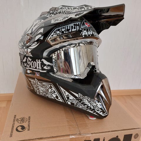 Airoh kypärä motocross- tai endurokäyttöön. Kypärässä on pitkä lippa ja leukasuoja, useita ilmanottoaukkoja sekä pehmustettu sisusta leukahihnalla. Mukana 100% ajolasit peililinssillä ja säädettävällä hihnalla. Kuvissa näkyvät ajohanskat kuuluvat kokonaisuuteen. Varusteet soveltuvat moottoripyörä- tai mopoajoon. Kypärä on kokoa M