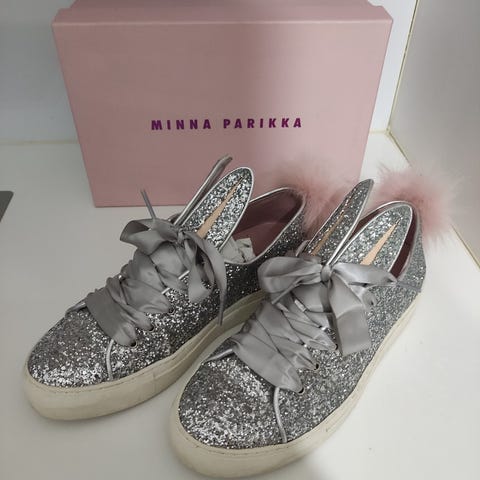 Minna Parikka Bunny Runner Rainbow tennarit, koko 38. Monivärinen glitterpintainen päällinen, jossa sinisen, vihreän, punaisen ja vaaleanpunaisen sävyjä. Nauhakiinnitys vaaleanpunaisilla nauhoilla.