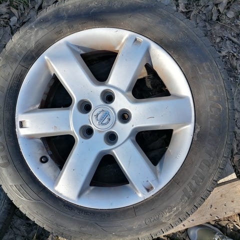 Kesärenkaat Nissan X-Trailin aluvanteilla. Hyvät, pehmeät renkaat, joissa hyvin pintaa jäljellä!