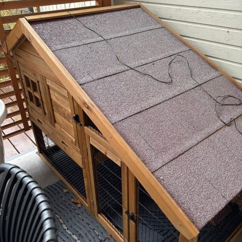 Pieni puinen kani tai kanakoppi ulkokäyttöön. Koppi on maalattu punaiseksi valkoisin listoituksin ja koristekuvioin. Rakenteessa on etuseinässä ovi ja pienempi aukko, jotka voidaan sulkea puuluukuilla. Tyydyttävässä kunnossa, painava nostaa, en mittaile tai varaile.