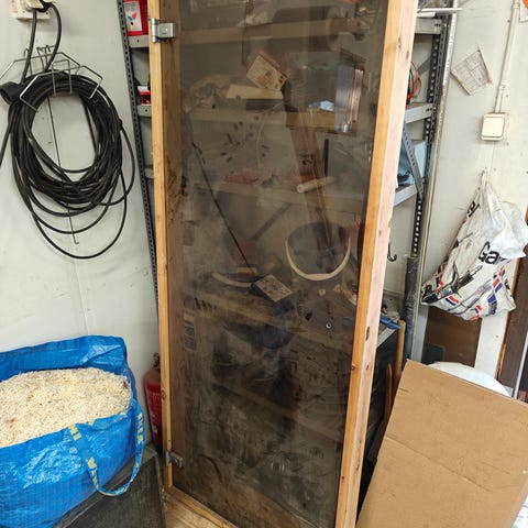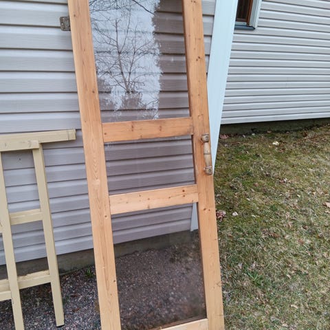 Käytetty lasiovi karmeineen. Karmien ulkoleveys 880mm. Korkeus 1900mm. Ruskehtava sävylasi.