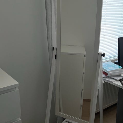 IKEA peili, jossa suorakulmainen muoto ja vaalea/valkoinen kehys. Soveltuu esimerkiksi eteiseen, makuuhuoneeseen tai vaatehuoneeseen kokovartalo- tai pukeutumispeiliksi. Peili voidaan asettaa nojaamaan seinää vasten tai kiinnittää seinälle, kiinnitystapa valitaan erikseen tarpeen mukaan. Peili on rikki monesta kohti. Tarjoa