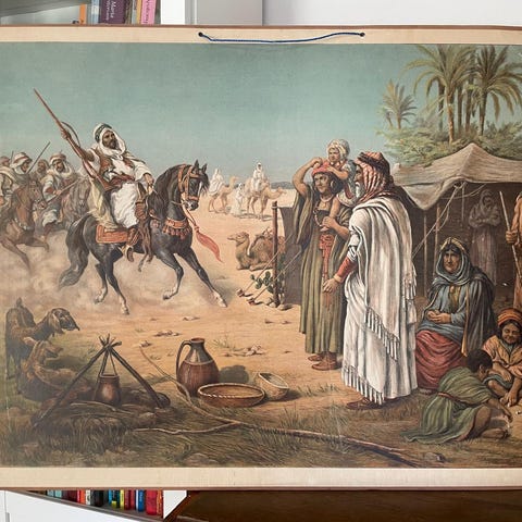 Uskonnollinen opetustaulu, jossa on raamatullinen aihe ja ihmishahmoja ulkoilmassa kivirakennuksen edustalla. Juliste sopii esimerkiksi kodin, seurakuntatilojen tai opetustilojen seinäkoristeeksi. Materiaali vaikuttaa olevan painokuva kartongille. Värit ovat moniväriset, ja kuva esittää historiallista, Lähi-idän ympäristöön sijoittuvaa tilannetta. Nouto Helsinki Kannelmäki tai postilla. 48x 68 cm. Katso myös muut kohteeni.
