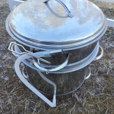 Teräksinen mehumaija. Kannesta ripa lähtenyt irti. Ei toimi induktio liedellä.