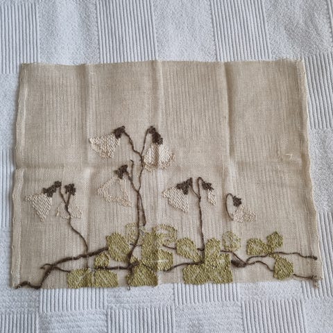 Kehystetty, kangaspuissa kudottu kuultokudos Sienimetsä, pellavaa, korkeus 88 cm ja leveys 69 cm, Maija Kolsi-Mäkelän malli.