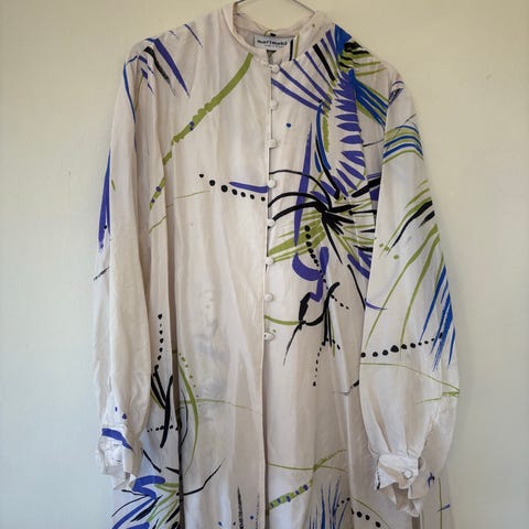 Marimekon silkkipaita Linssi kuosissa, koko 42. Materiaali on 100% silkkiä. Edessä on nappikiinnitys ja klassinen kaulus.