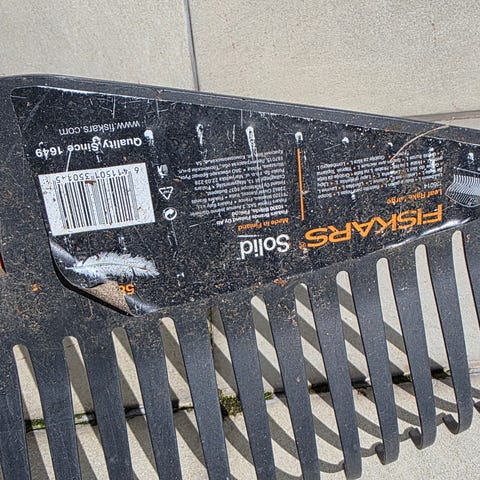 Kaksi rautaista ja puuvartiset puutarhaharavaa. Hinta 10 euroa kappale. Raasepori. Fiskars. Kulkeutuu omien menojen mukana lähialueille.