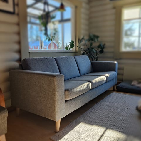 Mitat: Pituus 195cm (istuinosa 167cm), istuinkorkeus 48cm, selkänojan korkeus 65cm. Istuinsyvyys 52cm.