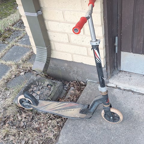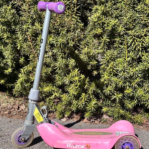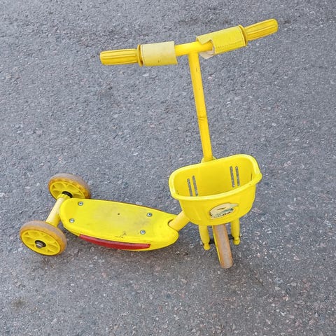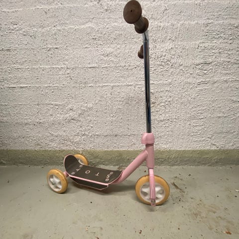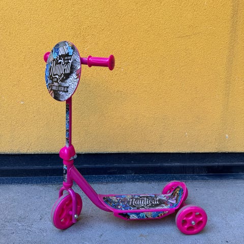 Tyttöjen pinkki potkulauta. Kolmipyöräinen, umpikumipyörät, jalkajarru. Edessä irrotettava koristelaatta. Tekstinä Hand drawn doodles Nautical vector art.