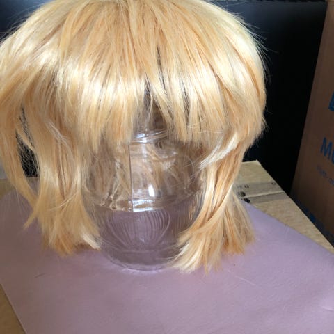 Peruukki on stailattu, lyhyt ja väriltään kylmän turkoosi.