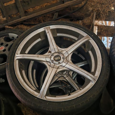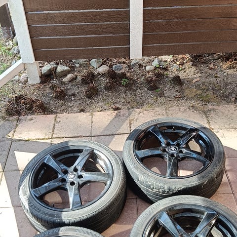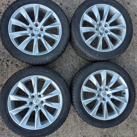 Näyttävät 22 kiekot, jotka olleet Volvo V90 alla. Vanteet jäi tarpeettomaksi kun otettiin ison peuran kanssa törmäystesti. Molemmat sai reilusti mustelmia ja tavallaan molempien tarina päättyi kohtaloon.
