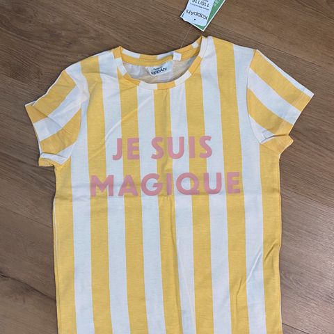 Keltainen t-paita. Iso tasku josta kurkistaa haisuli. Haisulin karvat on jo vähän kärsineet ja paidassa näkyy pieniä todella haaleita tahroja.