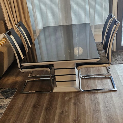 Myydään vaihtelun vuoksi noin yhdeksän vuotta vanha laadukas ja tukeva Pohjanmaan Kalusteen ruokailuryhmä lasikannella. Lasikannen alla on lähes uuden veroinen pöydän pinta. Muualle käytön jälkiä on jo vuosien varrella luonnollisesti tullut, mutta setin yleisilme on siisti ja nykyaikainen. Kankaat ovat 100 % ehjä. Taloudessa ei ole ollut kissaa tai koiraa, mutta pari marsua asustaa yläkerrassa. Nouto onnistuu joustavasti.