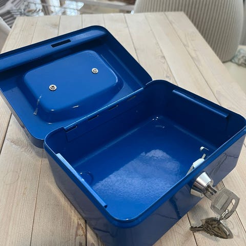 Myydään musta käteiskassalipas avaimilla ja rahanerottimella.