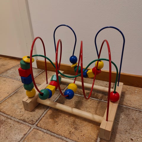 IKEA muotopalikkalaatikko, jossa puinen talonmuotoinen laatikko ja vihreä muovinen katto. Mukana erivärisiä ja -muotoisia palikoita, jotka pudotetaan kannen muotoaukkojen läpi laatikon sisään. Leikitty kunto.