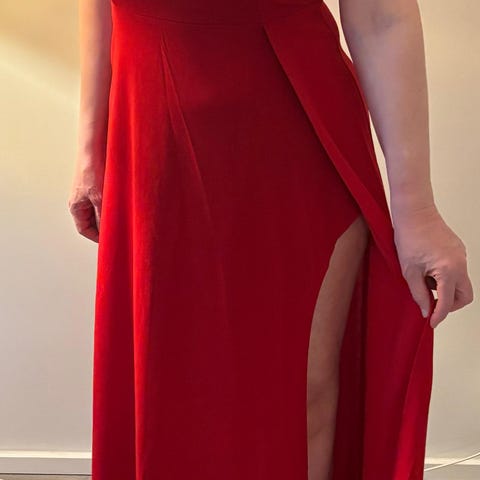 juhla- tai cocktailmekko naisille, koko 34. Mekko on oranssia polyesterikangasta. Mallissa on ohuet olkaimet ja edessä kietaisumainen, epäsymmetrinen helma, joka on edestä lyhyempi ja takaa pidempi. Selkäpuolella on vetoketju pukemisen helpottamiseksi. Sopii juhla- ja iltatilaisuuksiin. Pieni lika mutta ei ole näkyvä.