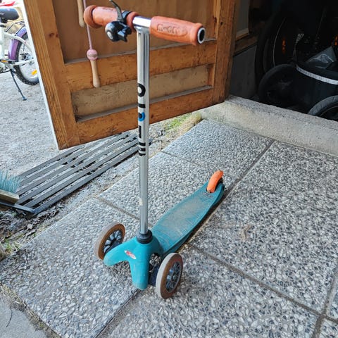 Lasten keltainen potkulauta. Kolmipyöräinen, umpikumipyörät, etukori. Korissa edessä kotkan kuva.