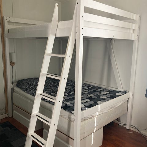 IKEA parvisänky metallirungolla. Sängyssä on korkea metallinen runko, ylös sijoitettu nukkumataso sekä puiset sälepohjat. Sängyn alle jää tilaa esimerkiksi työpisteelle tai säilytyskalusteille. Soveltuu yhden hengen nukkumiseen. Väri pääosin valkoinen, reunuksissa harmaita tekstiiliosia.
