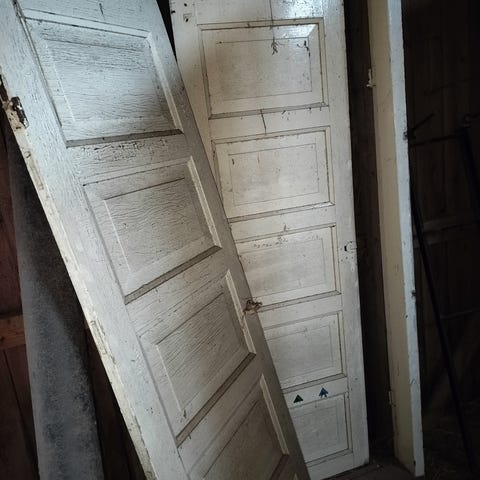 Puinen vanha peiliovi karmien kanssa. Ovi lienee 1800-luvun loppua, 1900-luvun alkupuolta, usealla peilijaolla. Toisella puoleln ovet ovat valkoisella maalipinnalla, toisella puolen ovet ovat ehkä beigeä, osa maalista irroitettu.