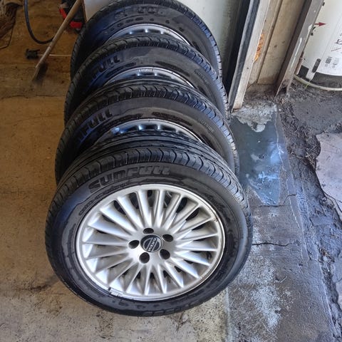 Tarpeettomana 2008 V70 Volvosta 205/55R16 kesäpyörät, hyvät kuviot renkaissa.