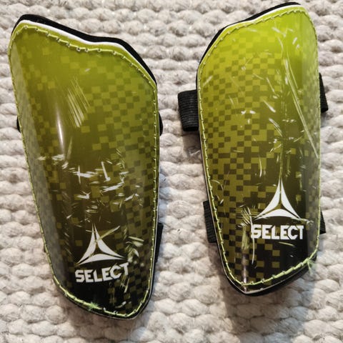 Select säärisuojat jalkapalloon. Pituus noin 15 cm, mitattu kuvissa näkyvällä tavalla. Vihreä kuviollinen kovamuovinen etuosa ja musta pehmustettu sisäpuoli. Kiinnitys kahdella joustavalla tarranauhalla per säärisuoja. Soveltuvat jalkapallon pelaamiseen ja muuhun vastaavaan lajikäyttöön, jossa tarvitaan säärien perussuojaa.