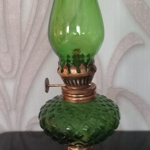 Vintage öljylamppu tyylinen pöytävalaisin, jossa on koristeellinen jalka ja vaaleanvihreä lasinen kupu. Valaisin edustaa klassista tyyliä, jossa on koristeellisia yksityiskohtia.