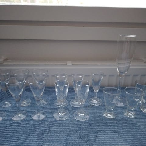 Astiasarja ja juomalasit. Kattauksessa on useita valkoisia ja sinisiä astioita, kuten lautasia, kulhoja, kuppeja ja kermakkoja sekä soikeita tarjoiluastioita. Lisäksi mukana on kirkkaista laseista koostuva juomalasisarja ja tummia pieniä laseja tai kuppeja. Sopii esimerkiksi arki- ja juhlakattauksiin useammalle hengelle. Hinta yhteensä kaikille astioille 15 euroa.Vain nouto.
