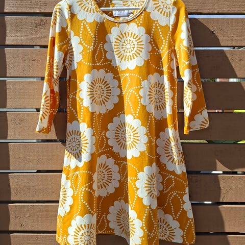 Ivana Helsinki Nordic Tricot -kesämekko naisille. Koko S. Mekko on keltaista, kuviollista polyesterikangasta. Mallissa on pitkät hihat, väljä leikkaus ja kerroksittain poimutettu helma. Pääntiessä on pieni pystykaulus ja nauhakiinnitys.
