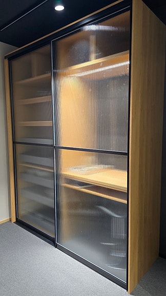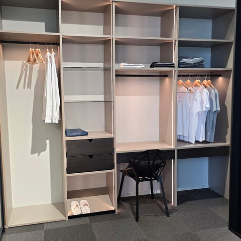 Ylellinen vaatehuonekaapisto Lahden Launeen myymälässä. Leveys 2780 mm x 1500 mm. Kaapistossa integroidut valot liiketunnistimella.
