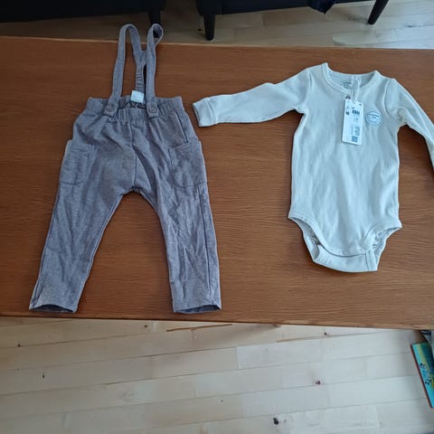 Lindexin body, koko 74 ja kahdet bodyn sävyihin mätsäävät Polarn O. Pyretin puuvillasukat, koko 16/18