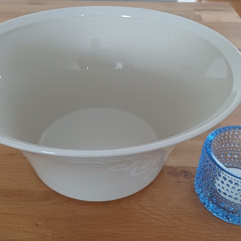 Pentik Vanilja kaunis iso kulho, vetoisuus 2,5 litraa. Korkeus 13 cm ja halkaisija yläosasta 27 cm. Pohjassa halkeama, joka ei ole "eskaloitunut". Nouto tai Toridiili.