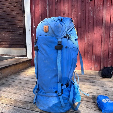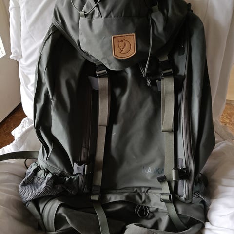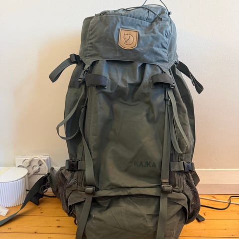 Fjällräven Kajka 100 -rinkka, tilavuus 100 litraa. Väriltään metsän vihreä. Rinkassa on säädettävä kantojärjestelmä, pehmustetut ja muotoillut olkaimet sekä lantiovyö. Selkäpaneelissa on ilmankiertoa parantava verkkorakenne. Rinkassa on useita kiristysremmejä, sivutaskuja ja alalokero, jotka helpottavat varusteiden organisointia. Soveltuu pitkille vaelluksille ja retkille, joilla tarvitaan suuren kantokyvyn rinkkaa.