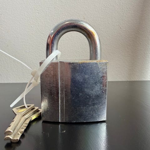 Kuvan uusi ja avaamattomassa pakkauksessaan oleva Abloyn PL350C/50 - munalukko eli sangan pituus 50mm ja kaksi classic -sarjan avainta. Varsin iso ja järeä...