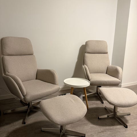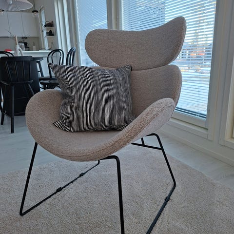 Myydään ylimääräiseksi jäänyt todella hyväkuntoinen beige/harmaa Jyskin Adslev nojatuoli. Tuolin hinta uutena 55€.