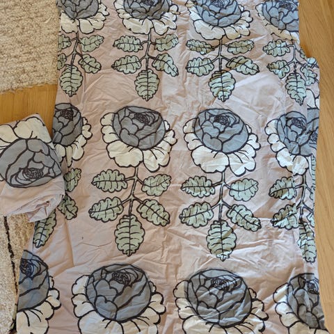 Marimekko Maalaisruusu pussilakanasetti. Kuosina Maija Isolan suunnittelema Maalaisruusu (1965), jossa on viininpunaisia ja valkoisia kukkia harmaalla pohjalla. Settiin kuuluu pussilakana, koko 150x210 cm, sekä tyynyliina, koko 50x60 cm. Materiaalina puuvilla. Soveltuu yhden hengen peitolle ja tyynylle.