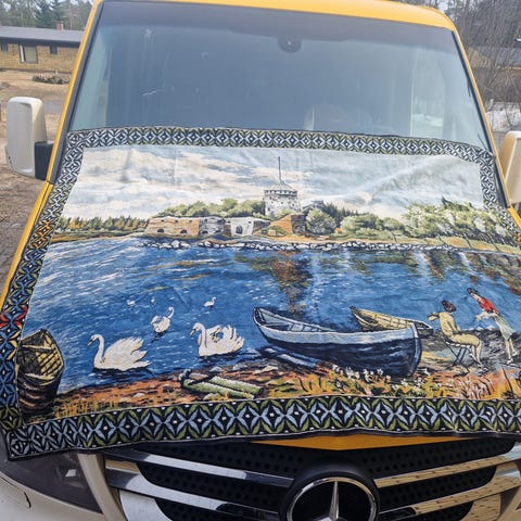 Seinäryijy, jossa valkoisella pohjalla ruskeasävyinen joutsenaiheinen kuviointi ja maisemakuva. Koko 82x76cm