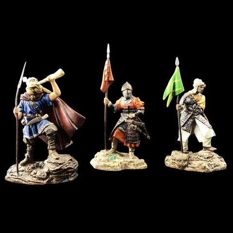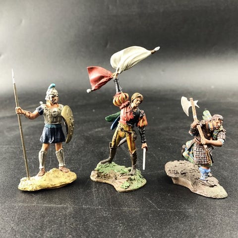 Savoyn merirekmentti 1702, kolme muskettisoturia, upseeri ja lipunkantaja. Täysin restauroituja ja uudelleen maalattuja figuureita, alkuperäinen valmistaja Alymer (Espanja) 1960-luvulta. Painavat, ja museokuntoiset. Toimitetaan laatikossa, jossa on siihen liittyvä box art. Restauroitu The Tin Soldierin työpajassa, Antwerpen. Numeroitu laatikko.