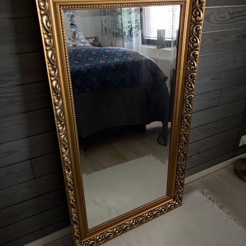 Peili jossa upea antiikkikultainen kehys. Peilin reunassa fasettihionta.