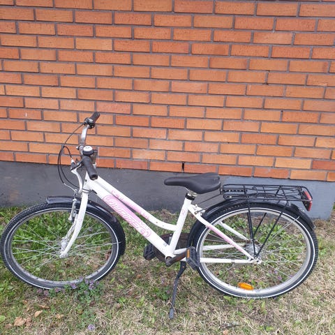 Vähän käytetty Jupiter polkupyörä 24" renkailla. Rungon väri on valkoinen, jossa on vaaleanpunaisia ja violetteja tehosteita. Pyörässä on jalkajarru takana ja käsijarru edessä.