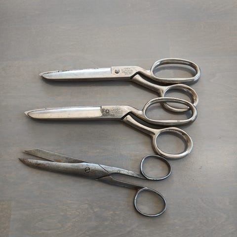 Keritsemissakset, sokerisakset (2), kiharruspihdit (2) ja Vanhat Fiskars sakset