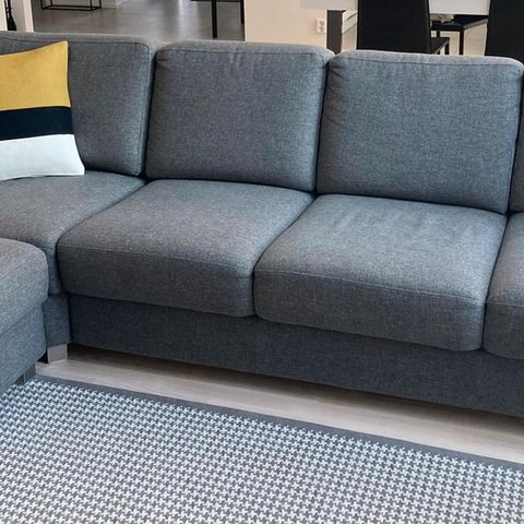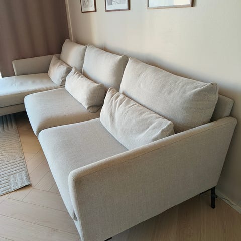 Suuri divaanisohva vaaleanharmaalla kankaalla ja puisilla tammijaloilla. Ostettu Lähdesmäeltä. Päätyosa irroitettavissa. Irralliset istuin- ja selkäosat.
