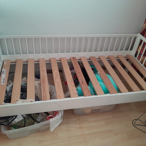 Edelleen tukeva ja toimiva lasten jatkettava sänky. Käytön jälkiä vuosien varrelta.