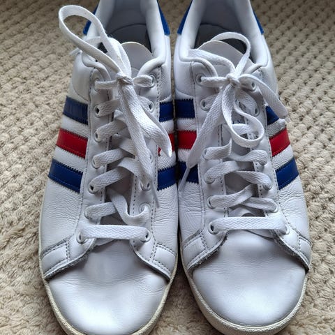 Adidas tennarit, koko 42. Väri valkoinen. Nauhakiinnitys ja matala varsi. Päällinen kangasta, ulkopohjassa kuvioitu kumipohja. Sopivat arkikäyttöön ja vapaa-aikaan. Jonkin verran likaa, tämä huomioitu hinnassa.