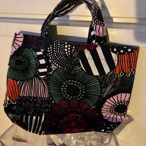 On kuin uusi. Laukun korkeus 27 cm, leveys 36 cm ja syvyys 12 cm. Lyhyet kantokahvat, sisäpuolella yksi vetoketjutasku. Laukku suljetaan magneettinapilla.
