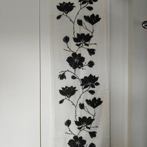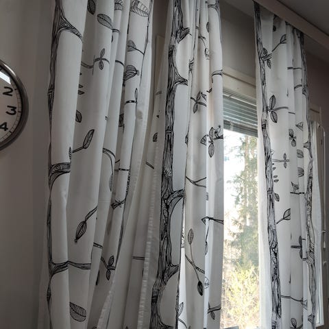 Kuvanmukaiset valkoiset verhot, kuvio hiukan läpikuultava , pituus n. 230cm ja leveys 140cm